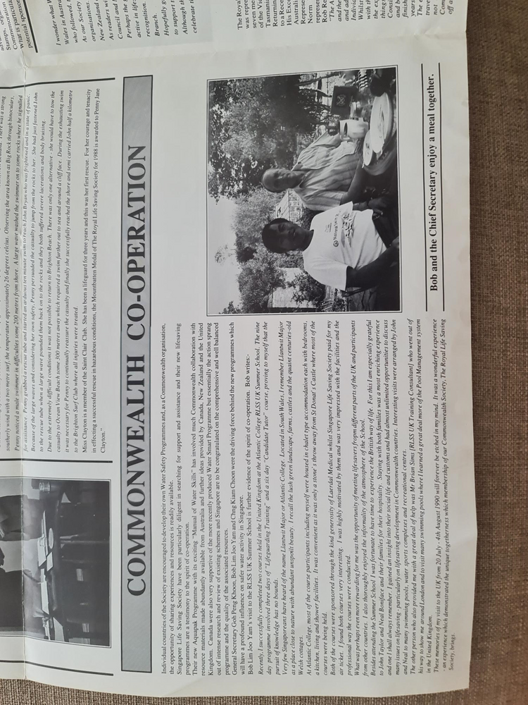 Bob was featured in the Royal Life Saving Society's Commonwealth Contact for being a driving force for introducing new programmes which will have a profound influence on the water safety in Singapore.